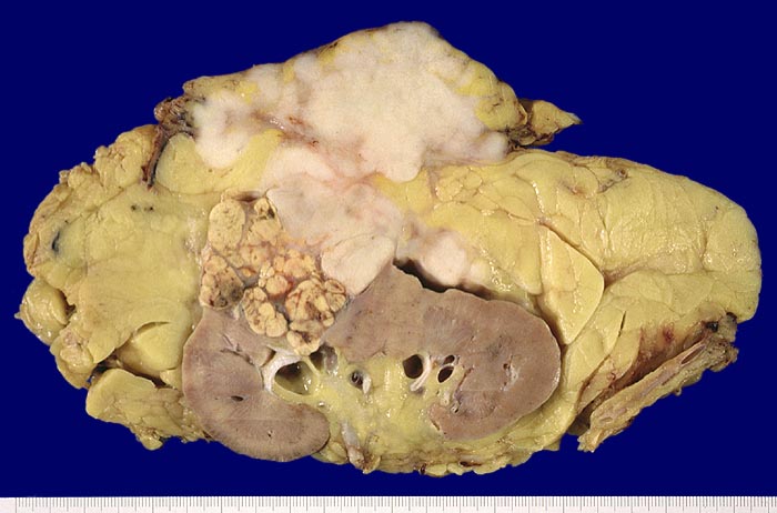 Tumor weisse Areale auf (sarkomatoide Komponente), die die Nierenkapsel und das perirenale