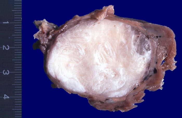 Weisser von einer Pseudokapsel umgebener scharf begrenzter Tumor umgeben von wenig Skelettmuskulatur. Fasrige Struktur der Schnittfläche.