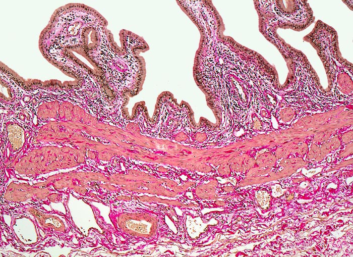 Die Gallenblasenschleimhaut bildet unregelmässige Falten, die bedeckt sind von einem hochzylindrischen Epithel. Auf die Mukosa folgt eine Schicht mit glatter Muskulatur. Am unteren Bildrand das Bindegewebe der subserösen Schicht.