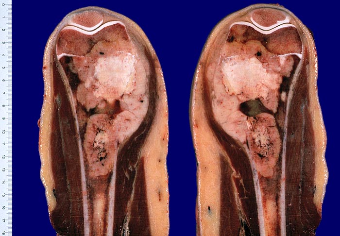 Tumor an klassischer Lokalisation im Bereich des distalen Femur. Das graubraune, teils hämorrhagische Tumorgewebe wächst infiltrativ und destruktiv. Es füllt den Markraum und infiltriert durch den Cortex unter Abhebung des Periosts in die Weichteile. Ungewöhnlich in diesem Fall ist der Durchbruch durch die Epiphysenfuge.