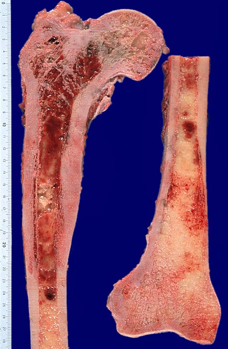 Das proximale Femurdrittel zeigt vergöberte Spongiosabalken im Bereich des Schenkelhalses und des Femurkopfes. Der Knochen ist im betroffenen Abschnitt unregelmässig aufgetrieben und die Kortikalis ist ebenfalls unregelmässig verdickt.