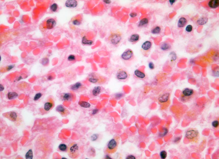 Ausschnitt aus der perivenulären Nekrosezone. Anstelle von Hepatozyten sind siderinbeladene Makrophagen mit braungefärbtem Zytoplasma getreten, welche die nekrotischen Hepatozyten phagozytiert haben. Die Makrophagen liegen eingebettet in ein blutreiches Maschenwerk aus Reticulinfasern. Einzelne blasse nekrotische Hepatozyten ohne erkennbare Kernstrukturen sind noch nicht abgebaut worden.