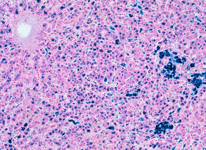 Links oben im Bild eine Zentralvene. Das Parenchym zeigt diffuse grobgranuläre Eisenpigmentablagerungen. Die dunkelblauen Flecken enstprechen einzeln und in Gruppen liegenden Kupffer'schen Sternzellen, welche stark eisenbeladen sind.