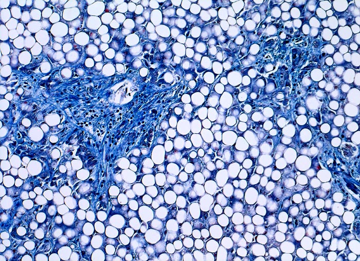 Zwei Portalfelder mit minimaler Fibrose und schütterem Entzündungsinfiltrat. Praktisch alle Hepatozyten enthalten eine solitäre grosse optisch leere Lipidvakuole.