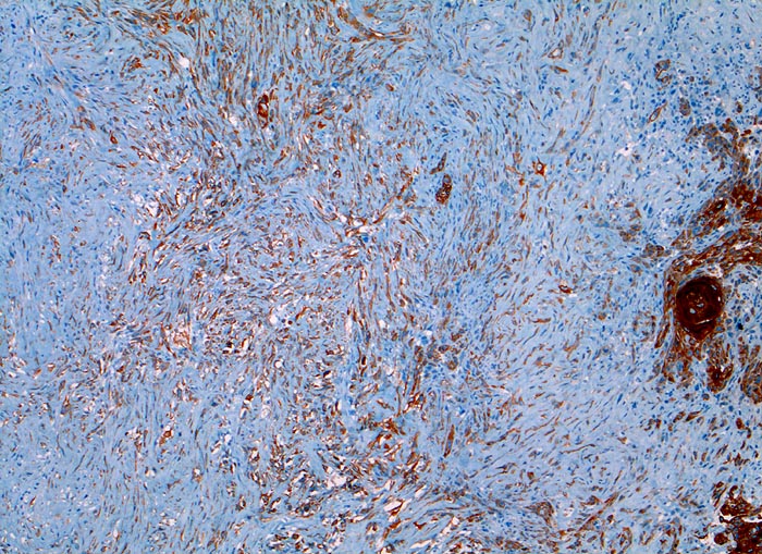 Der Panzytokeratinmarker Lu-5 färbt sowohl die plattenepithelial differenzierten verhornenden Tumor-Zellstränge rechts im Bild als auch ein Teil der sarkomatoiden entdifferenzierten Tumorkomponente an.