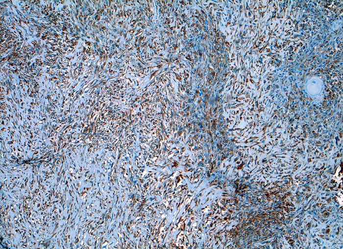 Die spindeligen Tumorzellen zeigen eine diffuse Positivität für Vimentin.