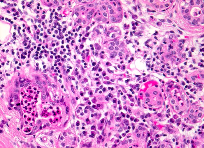 Drüsenläppchen mit ödematösem lymphoplasmazellulär infiltriertem Stroma. Zwei Drüsenlumina sind leicht erweitert und enthalten Eiter. Die Drüsenazini sind atrophiert.