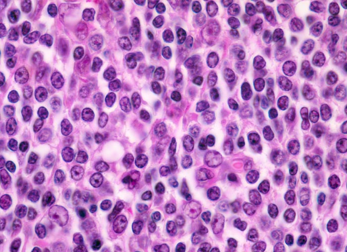 Das neoplastische Infiltrat besteht aus kleinen zentrozytoiden Zellen mit leicht entrundeten Kernen und wenig Zytoplasma. Eingestreut einzelne immunoblastäre Zellen.