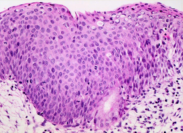 Metaplastisches Plattenepithel der Portio. Vergrösserte leicht hyperchromatische Kerne und Mitosen bis auf halbe Epithelhöhe. Weitgehend erhaltene Architektur. Entzündungsinfiltrat im Stroma.