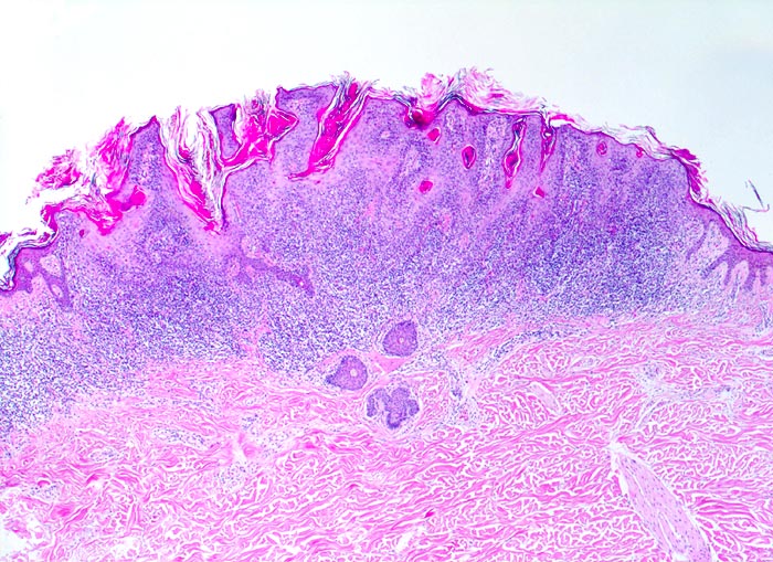 Symmetrischer hyperkeratotischer Tumor mit akanthotischer Verbreiterung der Epidermis. Ausgeprägtes bandförmiges Entzündungsinfiltrat.