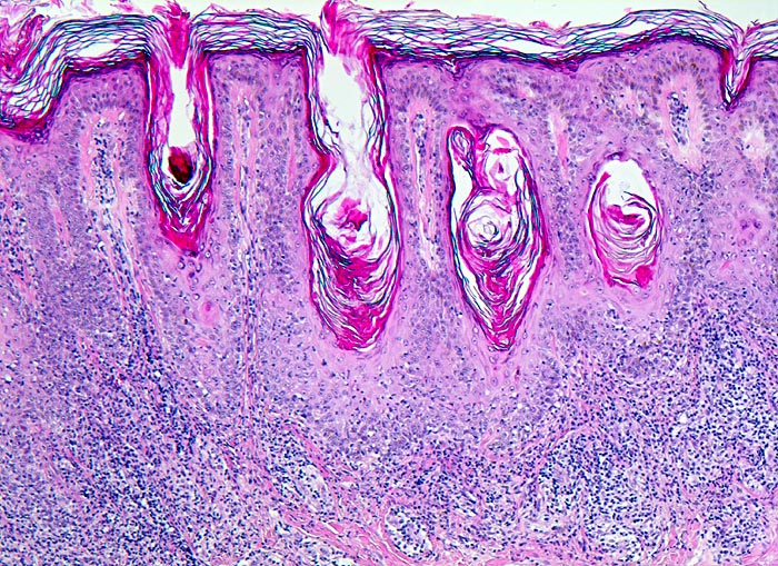Hyperkeratotischer Tumor mit akanthotischer Verbreiterung der Epidermis. Ausgeprägtes bandförmiges Entzündungsinfiltrat in der dermoepidermalen Junktionszone.
