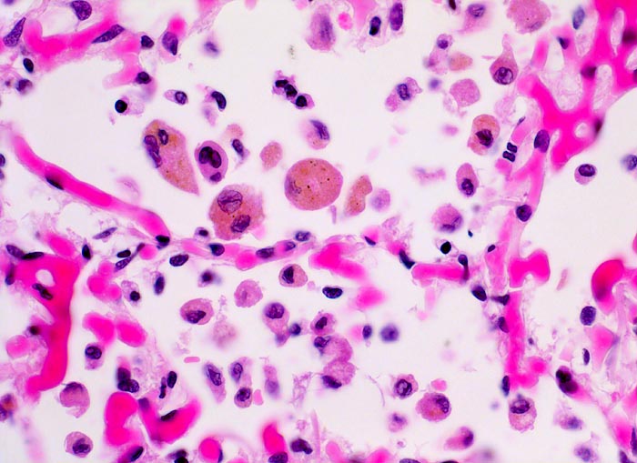 Die Kapillaren in den Alveolarsepten sind prall mit Blut gefüllt (Stauung). Bei sehr starker Stauung kann ein Teil des Blutes in die Alveolarräume übertreten und wird dort von den Alveolarmakrophagen phagozytiert. Deren Zytoplasma ist mit braungelbem Hämosiderin gefüllt. Daneben finden sich auch kleinere Makrophagen mit reichlich fein vakuolisiertem Zytoplasma.