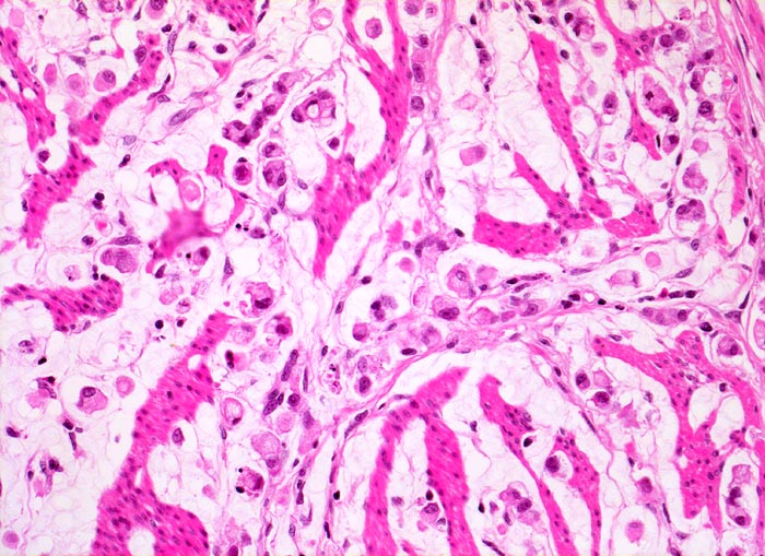 Ein Grossteil des Tumorinfiltrats besteht aus einzeln liegenden Siegelringzellen mit intrazytoplasmatischen Schleimvakuolen. Zwischen den Tumorzellen liegen Reste der Magenwandmuskulatur.