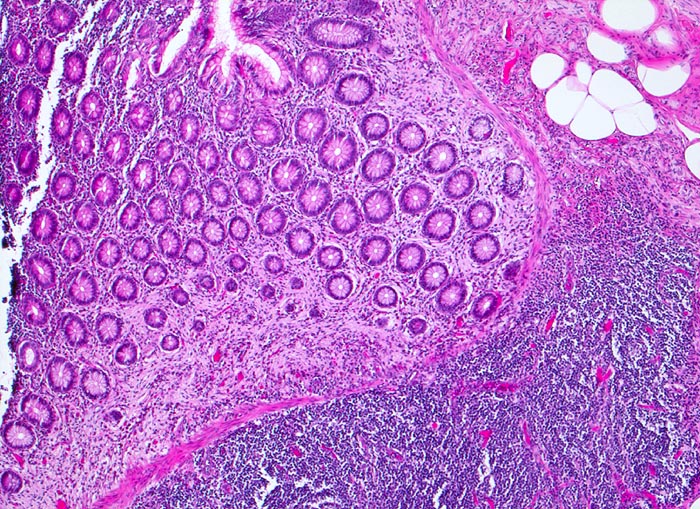 In den basalen Abschnitten ersetzt auffallend helles lockeres Gewebe die Kolonkrypten (proliferierte Nervenfasern).