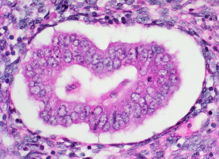 Drüsenschlauch mit mehrreihigem Epithel. Dichtliegende Kerne.