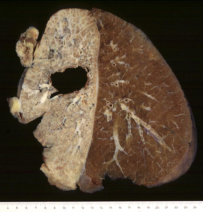Ausgedehnte Nekrosehöhle in den Segmenten 3 und 4 des linken Oberlappens. Diese Höhle misst im grössten Dm 5cm. Tumor ist nicht sicher erkennbar. Das gesamte Gewebe des Oberlappens ist gelblich