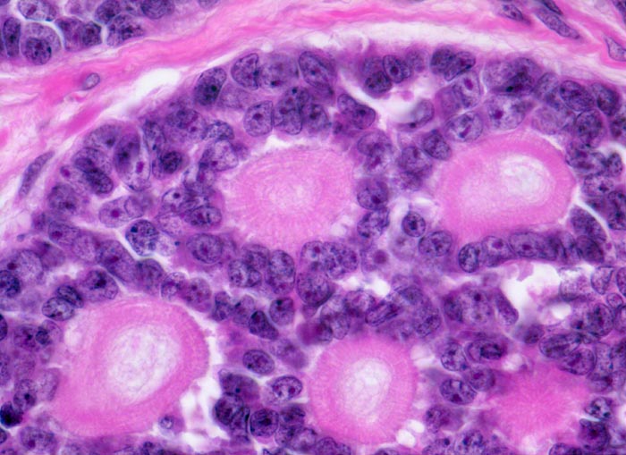 Kribriformes Wachstumsmuster mit zystischen Hohlräumen. Diese enthalten eosinophiles hyalines Material. Es handelt sich nicht um echte Lumina von Gängen oder Drüsen, sondern um Einschlüsse, die im Kontakt stehen zum Tumorstroma. Kleine Tumorzellen mit eckigen hyperchromatischen Kernen mit prominenten Nukleolen.