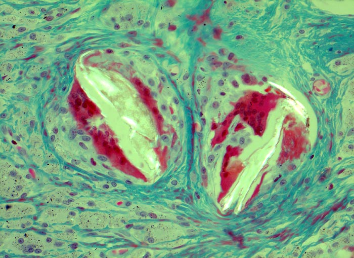 Langes fadenförmiges doppelbrechendes Fremdmaterial (Polyethylen) umgeben von Fremdkörperriesenzellen. Neben den Riesenzellen zahlreiche Histiozyten mit doppelbrechendem granulärem und stäbchenförmigem Material (Zirkondioxid).