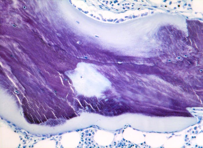 Auf dem stark verbreiterten hellblauen Osteoidsaum sitzt eine Osteoblastentapete aus kubischen Osteoblasten. Innerhalb des mineralisierten Knochenbalkens Streifen von hellblauem nicht mineralisiertem Osteoid (begrabenes Osteoid). Die Mineralisationsfront ist durch eine unvollständige Mineralisation unscharf begrenzt.