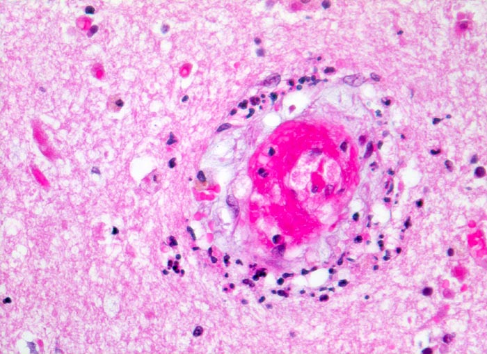 Gefäss mit frischerem Thrombembolus. Im Randbereich des Gefässes zahlreiche neutrophile Granulozyten. Im Hirnparenchym hypereosinophile nekrotische Neurone ohne erkennbare Kerne.