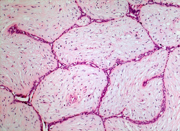 Fibroadenome können zwei Wachstumsmuster zeigen. Der hier abgebildete Tumor zeigt eine Kompression der Drüsen durch die proliferierenden Stromazellen entsprechend einem intrakanalikulären Wachstumsmuster. Bei einer zirkumferentiellen Proliferation von Tumorzellen um die Drüsen spricht man von perikanalikulärem Wachstumsmuster. Die beiden Wachstumsmuster haben keine klinische Bedeutung.