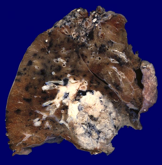 Auf Schnitt ein wahrscheinlich vom hinteren basalen Segment-Bronchus des Unterlappens ausgehender weisslicher, zentral zerfallender, teils