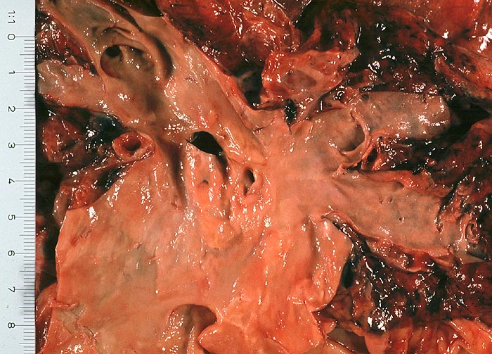 Ausgeprägte Dilatation des Pulmonalarterienhauptstammes und Ausbildung fibröser Plaques. Die Pulmonalarterien zeigen auch in der Peripherie eine kräftige Wand.