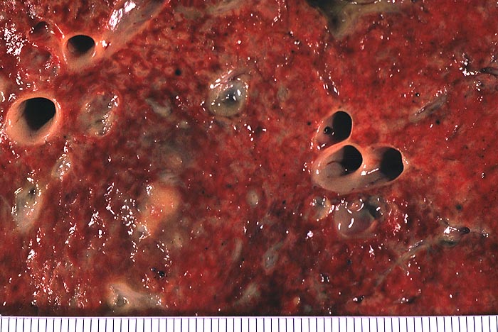 Infolge Parenchymeinschmelzung haben sich mehrere Abszesse im Parenchym ausgebildet. Die Galle verleiht dem Eiter einen grünlichen Farbton.