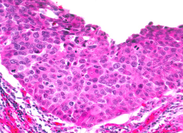 Verbreitertes Urothel. Mässig ausgeprägte Zellkernpolymorphie. Deutliche Vergösserung der hyperchromatischen Kerne mit Verschiebung der Kern-Zytoplasmarelation. Polaritätsverlust. Mitose im obersten Epitheldrittel.