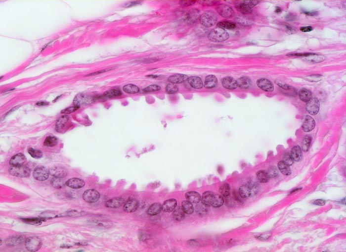 Tubuläre einreihige Karzinomdrüse ohne Basalmembran. Die Tumorzellen zeigen auffallende apikale Ausziehungen des Zytoplasmas (Snouts). Die Tumorzellkerne sind auffallend bland. Eine Myoepithelschicht fehlt.
