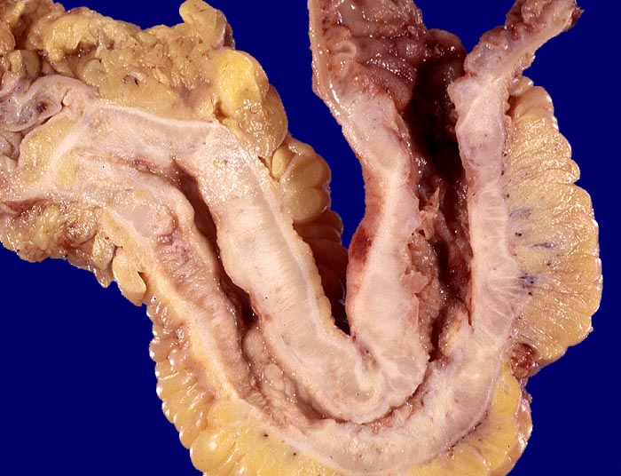 Auf dem Längsschnitt durch die Darmwand ist ein vergröbertes bis aufgehobenes Schleimhautrelief und eine ausgeprägte fibrotische Wandverdickung erkennbar.