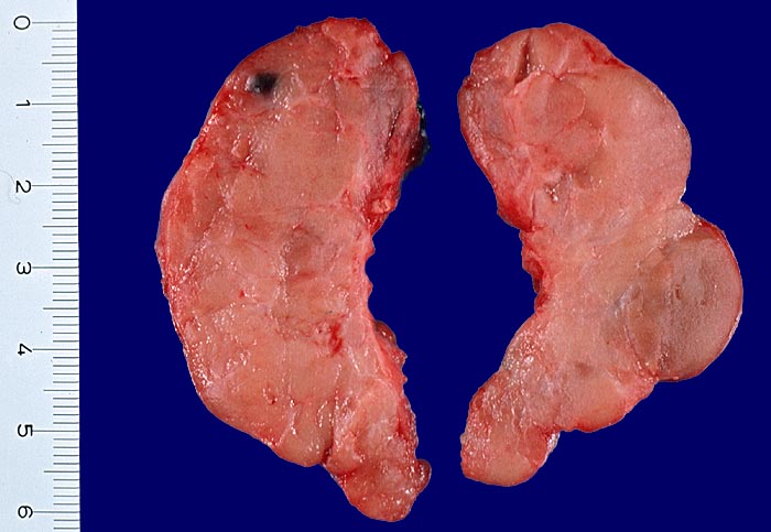 Aufgrund der Entzündungsinfiltrate auffallend helles knotiges Schilddrüsenparenchym. Die Drüse ist kaum vergrössert.