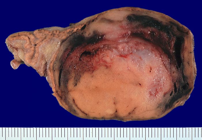 Inhomogen gefärbter, teils hämorrhagischer braun-rot gefleckter Tumor ausgehend vom Nebennierenmark. Die Nebennierenrinde ist unauffällig.