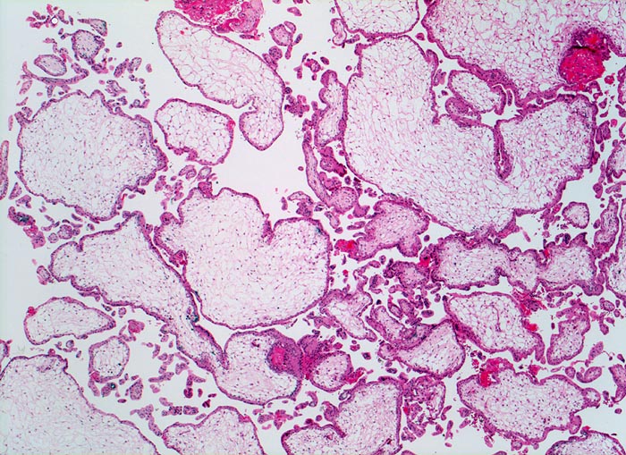 Grosse plumpe mangelhaft verzweigte Zotten. Mangelhafte Vaskularisation und hydropische Umwandlung des Stromas der Plazentarzotten.