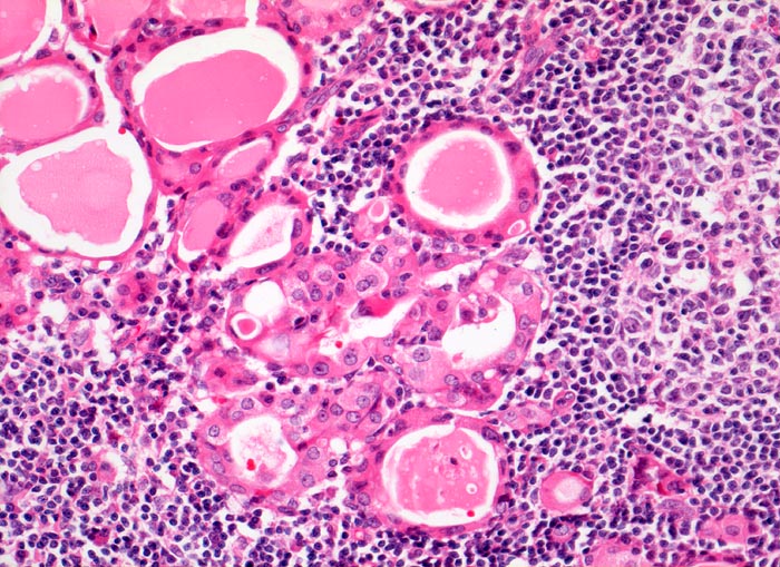 Rechts im Bild das Keimzentrum eines Lymphfollikels. Die Schilddrüsenfollikel im Bildzentrum sind umgeben von einem lymphozytären Entzündungsinfiltrat. Das Follikelepithel zeigt eine oxyphile Degeneration des Zytoplasmas.
