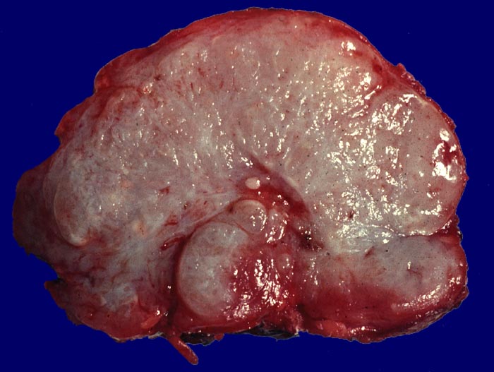 Der diffus befallene Lymphknoten ist vergrössert. Die Schnittfläche ist grauweissglänzend mit fasriger Struktur ähnlich rohem Fisch.