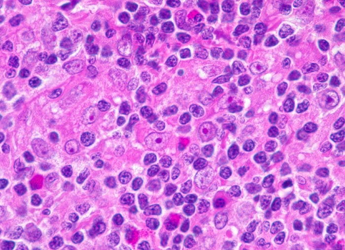 Nachweis von Hodgkin-Zellen: grosse, blastoide Zellen mit grossem Kern und grossem eosinophilen Nukleolus. Ansonsten gemischtzelliges Infiltrat aus reaktiven Zellen: Lymphozyten, Histiozyten, Plasmazellen und eosinophilen Granulozyten.