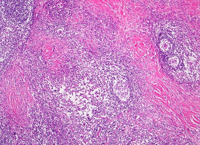 Die noduläre Sklerose ist ein Subtyp des klassischen Morbus Hodgkin mit Kollagenbändern, die mindestens einen Knoten lymphatischen Gewebes umschliessen. Diese enthalten Hodgkin- und Reed-Sternberg Zellen in Form von Lakunarzellen.