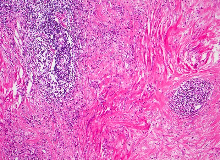Zerstörung der regulären Zonierung und Gliederung des Lymphknotens durch breite Kollagenfaserstränge, welche Knoten von lymphatischem Gewebe abgrenzen.
