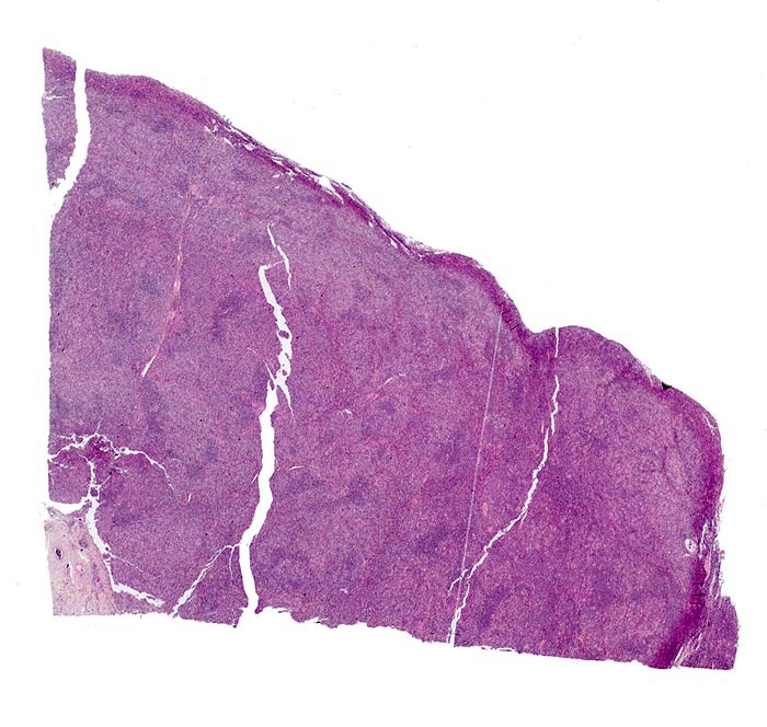 Vollständige Aufhebung der normalen Lymphknotenstruktur. Lymphfollikel sind nicht vorhanden.