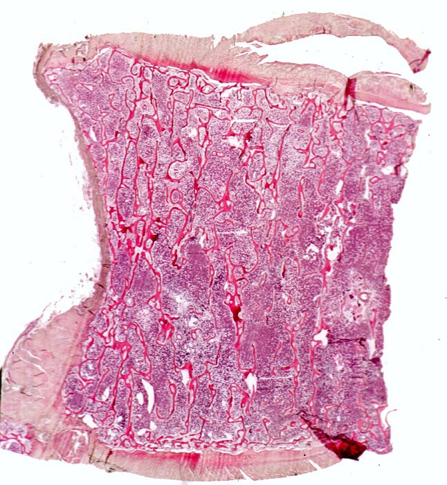 Auffallend dünne Spongiosabälkchen mit Resorptionslakunen, welche die Bälkchen z.T. tunnelartig aushöhlen.