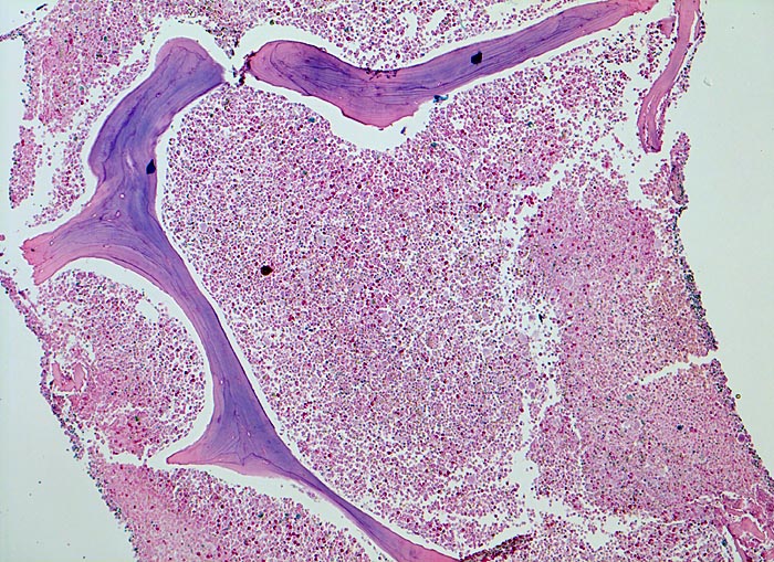 Vollständige Verdrängung von normalem blutbildendem Mark und Fettmark durch verschiedene Reifungsstufen der Myelopoese (buntes Bild). Zellularität gegen 100% (sogenanntes "packed marrow").