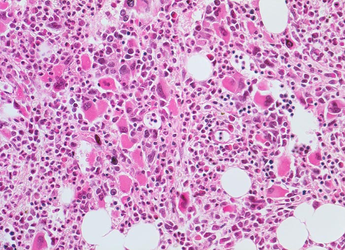 Vermehrung von atypischen in Gruppen liegenden Megakaryozyten in perisinusoidaler Position. Typisch ist die intravasale Hämopoese in dilatierten Sinusoiden. Hyperplasie von ausreifenden Granulozyten. Erythropoese hypoplastisch. Durch die Fibrose entsteht der Eindruck von strömenden Zellen.