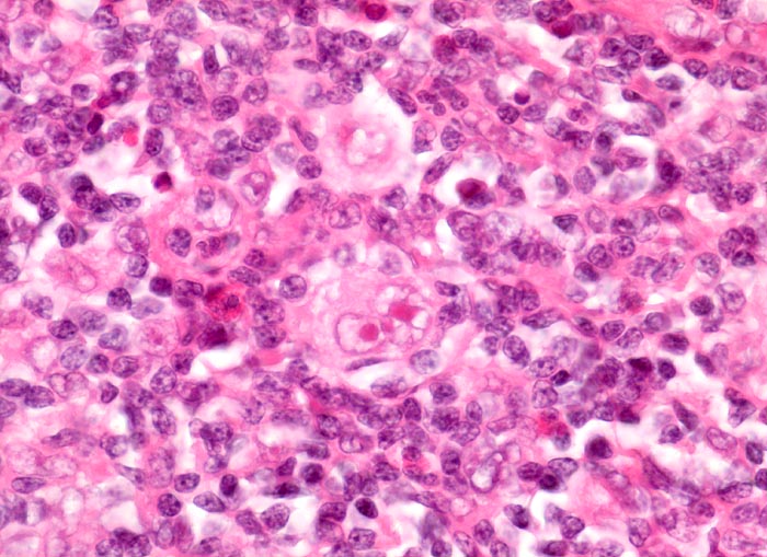 In der Bildmitte eine Reed-Sternbergzelle mit spiegelbildlich angeordneten Kernen mit sehr prominenten eosinophilen Nukleolen. Die Tumorzelle ist umgeben von einem reaktiven gemischtzelligen Infiltrat. Oberhalb der Reed-Sternbergzelle eine einkernige neoplastische Hodgkinzelle umgeben von einem schmalen Spaltraum.