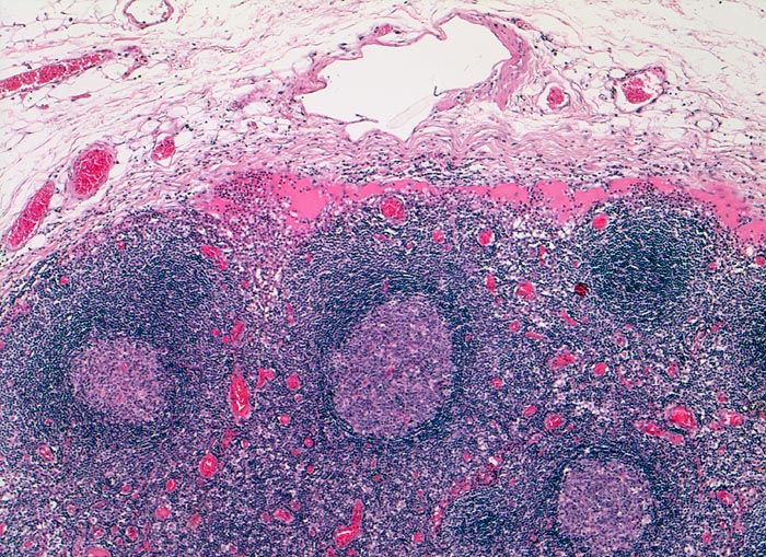 Lymphknotenkortex mit mehreren Sekundärfollikeln mit hellem Keimzentrum umgeben von einer leicht asymmetrischen dunklen Mantelzone und einer schlecht abgrenzbaren helleren Marginalzone. Angrenzend an die zarte bindegewebige Kapsel ein afferentes Lymphgefäss mit erkennbaren Klappen und der Marginalsinus.