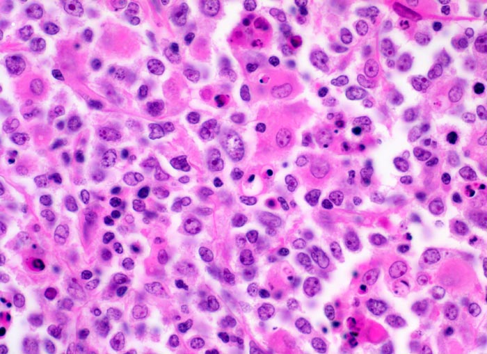 Mittelgrosse polymorphe Tumorzellen mit unregelmässig geformten, teils lobulierten Kernen. Gelegentlich sind mehrere randständige Nukleolen erkennbar (Zentroblastische Variante). Schmaler Zytoplasmasaum. Neben den Tumorzellen sind zahlreiche Histiozyten mit reichlich eosinophilem Zytoplasma und ovalen Kernen ohne Atypien nachweisbar. Das Zytoplasma der Histiozyten enthält teilweise phagozytierte Zelltrümmer.