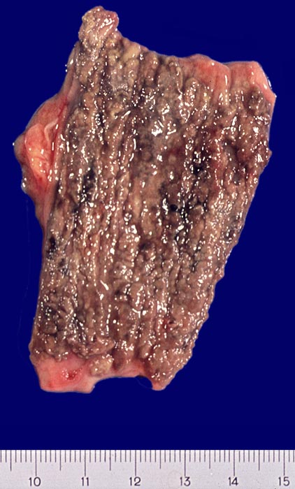 Flächenhafter membranartiger graubrauner grobhöckriger Belag auf der Ösophagusschleimhaut.