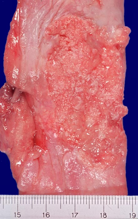Unregelmässig begrenzter Tumor im Schleimhautniveau mit grob granulierter Oberfläche.