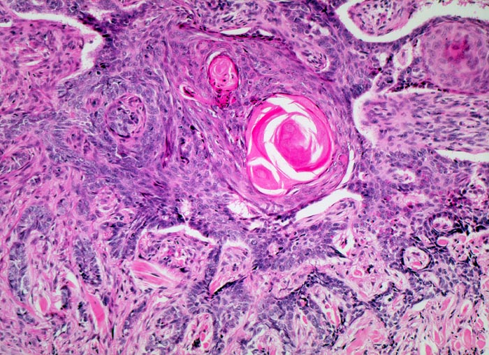 Zackig begrenzte Epithelverbände aus basaloiden Zellen mit randständiger Palisadierung. Hornperlen im Zentrum der grössten Epithelverbände.
