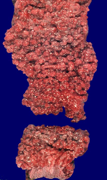 Polypenrasen im gesamten Rektum. Zwischen den einzelnen Polypen nur noch sehr wenig Schleimhaut erkennbar. Unten im Bild die tumorfreie Analmanschette.